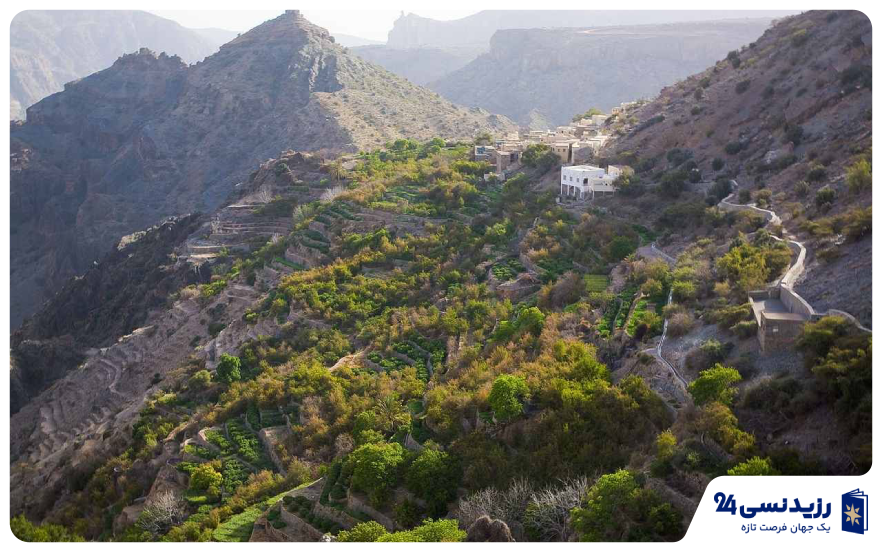 جبل اخضر منطقهای خنک و کوهستانی است که بهدلیل باغهای پلکانی و روستاهای سنتی مشهور شده است. محصولات کشاورزی مانند انار، زردآلو و گل رز در این منطقه بهصورت گسترده کشت میشود. مسیرهای پیادهروی میان باغها و روستاها جذابیت زیادی برای گردشگران ایجاد میکند. تفاوت اقلیم این منطقه نسبت به شهر، آن را به مقصدی مناسب برای سفرهای کوتاه تبدیل کرده است.
