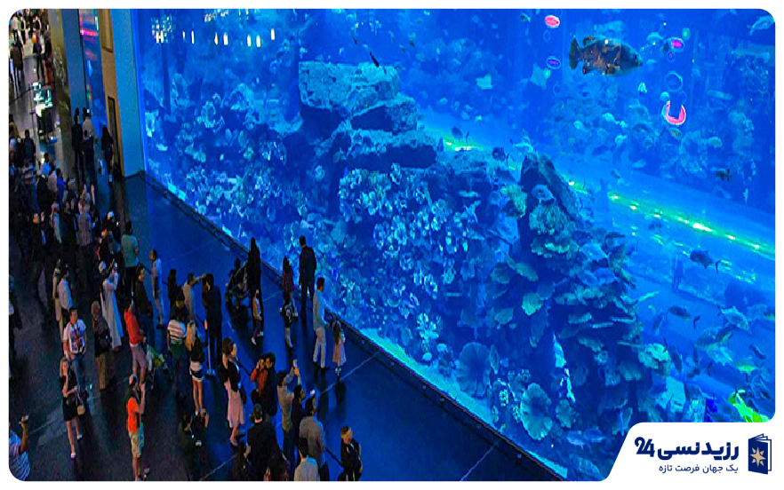 آکواریوم دبی مال یکی از مهمترین جاذبههای این مرکز خرید است و در قلب مجموعه قرار دارد. این آکواریوم بیش از ۳۳ هزار جانور آبزی را در مخزن عظیم خود جای میدهد و امکان مشاهده حیوانات مختلف را در فضایی کاملاً سرپوشیده فراهم میکند. تونل شیشهای آکواریوم تجربهای نزدیک از دنیای زیرآب ایجاد میکند و بازدیدکنندگان میتوانند از فاصله کم کوسهها، سفرهماهیها و دیگر موجودات را تماشا کنند.برنامههای آموزشی برای کودکان، تور مراقبت از حیوانات، بازدید از بخش قرنطینه و امکان مشاهده آزمایشگاه آکواریوم برای علاقهمندان فراهم شده است. قایقهای کفشیشهای نیز فرصتی ایجاد میکنند تا بازدیدکنندگان بدون ورود به آب، از سطح مخزن حیوانات را مشاهده کنند. بخش باغوحش زیرآبی نیز مجموعهای از حیوانات خاص مانند ایگوانا، مارها و پنگوئنها را در فضایی مجزا به نمایش میگذارد.