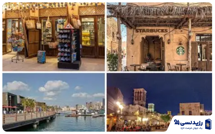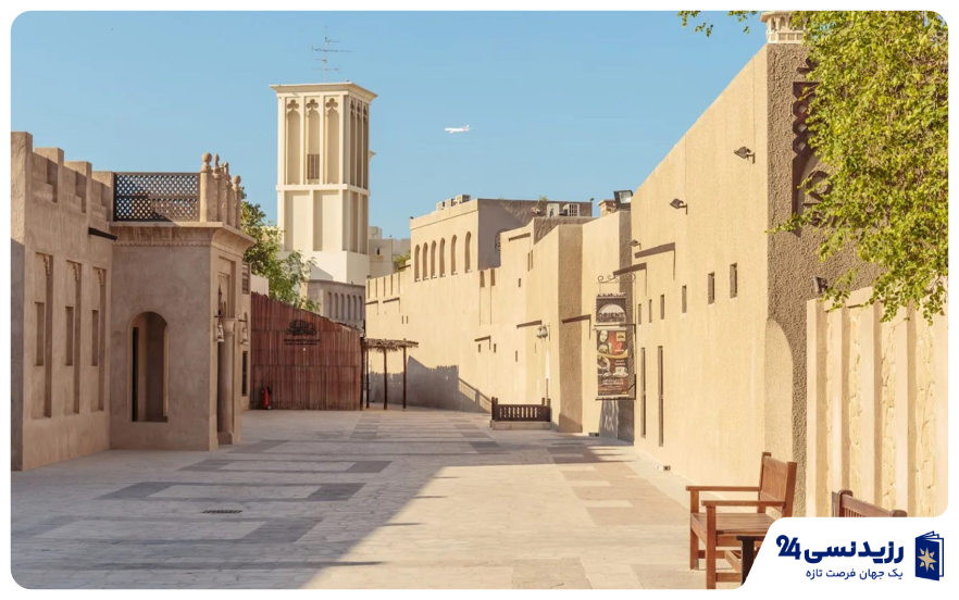 بخش تاریخی بازسازی معماری سنتی، کوچه‌های باریک، بناهای الهام‌گرفته از دبی قدیم بازار میراث، بادگیرها، فضاهای فرهنگی