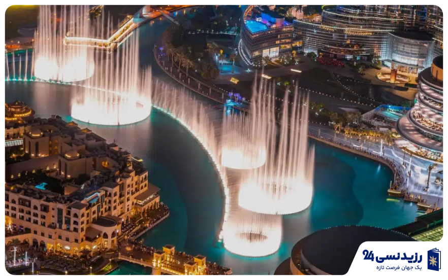 آبنمای دبی مال در کنار برج خلیفه قرار دارد و یکی از بزرگترین آبنماهای موزیکال جهان است. نمایشهای این آبنما همراه با موسیقی و نورپردازی اجرا میشود و جریان آب تا ارتفاع بلند پرتاب میشود. اجراهای روزانه در ساعات مشخص آغاز میشوند و هر نمایش چند دقیقه ادامه دارد.