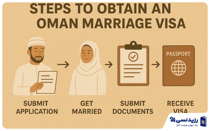 فرآیند اخذ ویزای ازدواج عمان با ارائه پرونده در دفتر فرمانداری آغاز می‌شود و پس از آن پلیس، مدارک و شرایط طرفین را بررسی می‌کند. حضور زوجین در عمان پیش از ثبت ازدواج و ارائه مدارکی که نشان‌دهنده واقعی‌بودن رابطه باشد، از الزامات اصلی محسوب می‌شود. پس از تکمیل بررسی‌ها، مجوز ازدواج صادر شده و ادامه روند اداری برای دریافت اقامت و ثبت رسمی ازدواج انجام می‌شود. این مراحل به‌صورت منظم باید طی شوند تا درخواست بدون مشکل پذیرفته شود.