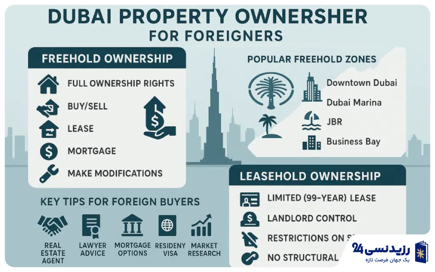 راهنمای خرید ملکراهنمای سرمایهگذاری طاها موسوی ۵ آذر ۱۴۰۴ انواع مالکیت ملک در دبی | تفاوت فریهولد و لیزهولد و قوانین مالکیت برای خارجیها